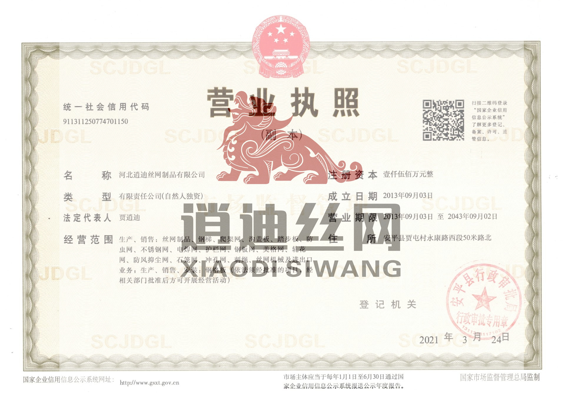 河北逍迪絲網(wǎng)制品有限公司誠信天下,誠信是我們公司一個原則問題不可撼動的,以心中有誠信的思想結(jié)交五湖四海的朋友,能達到雙贏是最好的,我們堅信朋友多了路好走,我們公司都是老朋友多,我們一直是這樣做的。河北逍迪絲網(wǎng)制品有限公司成立于2013年注冊資本壹仟伍佰萬整,主要生產(chǎn)沖孔網(wǎng),鋼格板,金屬防蟲網(wǎng),如實的實體廠家,是一家-研發(fā)-銷售-生產(chǎn)-安裝-售后一條龍公司,2019年通過了ISO 9001認證管理體系符合GB/T 19001-2016/ISO 9001:2015標(biāo)準(zhǔn),同時通過了SGS認證,擁有商標(biāo)版權(quán)2品牌,擁有一個著作版權(quán),河北逍迪絲網(wǎng)制品有限公司位于中國有名的(絲網(wǎng)之鄉(xiāng))安平縣,于天津,北京,雄安,石家莊相鄰,交通非常發(fā)達,出口可以選擇天津港口非常近每天都有接貨送貨往返車輛,空運可以選擇石家莊正定機場,附近也有鐵路運輸,當(dāng)?shù)剡€有兩個生態(tài)物流園區(qū)發(fā)往全國各地,我們沖孔網(wǎng)工廠生產(chǎn)設(shè)備有:普通沖壓機,高速沖壓機,自主研發(fā)小微孔沖壓機,龍門沖,磚塔沖孔,重型沖孔機,萬瓦級別激光切割機,3000W激光切割機,焊接設(shè)備,折彎機,校平機,剪板機,精密校平機,(對板面平整度要求苛刻的客戶群體0.5-0.2誤差)我們公司銷售市場沒有局限性國內(nèi)國外都供應(yīng),擁有出口權(quán)...